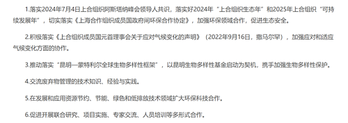 7月8日,以“攜手綠色發(fā)展,推動(dòng)人與自然和諧共生”為主題的上海合作組織國家綠色發(fā)展論壇在山東省青島市開幕。本次論壇是中方作為輪值主席國舉辦的首場高級別活動(dòng),旨在推動(dòng)上合組織國家在綠色能源、綠色產(chǎn)業(yè)、應(yīng)對氣候變化等領(lǐng)域深度合作。會(huì)上發(fā)布“共建綠色發(fā)展伙伴關(guān)系,共促可持續(xù)發(fā)展”倡議。(據(jù)中國政府網(wǎng)、生態(tài)環(huán)境部)