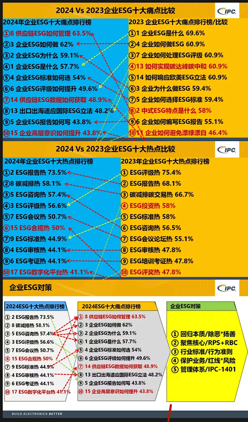 由國際電子工業(yè)聯(lián)接協(xié)會(huì)IPC-1401ESG管理體系標(biāo)準(zhǔn)技術(shù)組(以下簡稱“IPC-1401標(biāo)準(zhǔn)技術(shù)組”)發(fā)起,公益時(shí)報(bào)可持續(xù)發(fā)展研究院等數(shù)十家單位協(xié)辦,“2024企業(yè)ESG十大熱點(diǎn)十大痛點(diǎn)”調(diào)查結(jié)果在上海2024IPC中國電子制造業(yè)年會(huì)ESG可持續(xù)發(fā)展論壇正式發(fā)布。“ESG報(bào)告熱”位居十大熱點(diǎn)之首,得票率73.5%,從2023年的第二名上升一位。去年熱點(diǎn)第一名“ESG評(píng)級(jí)熱”下滑至第四名。“供應(yīng)鏈ESG管理”位居十大痛點(diǎn)之首,得票率63.5%,首次進(jìn)入前十。2023年痛點(diǎn)第一名“ESG是什么”下滑至第四名。