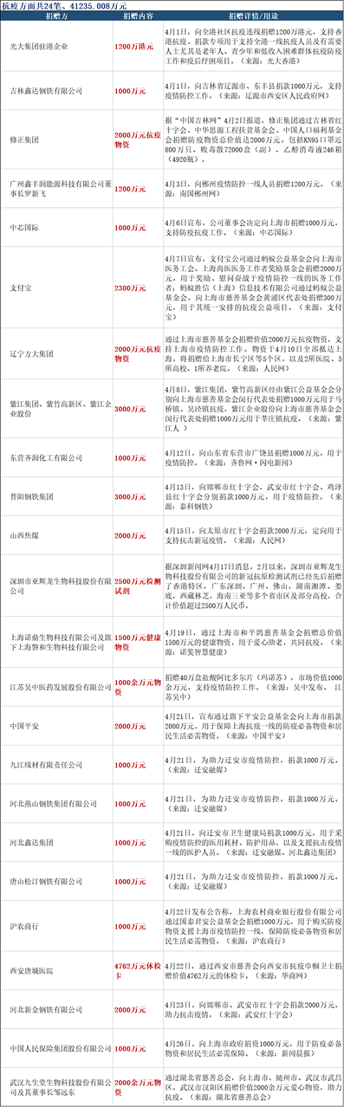 用于抗疫的捐贈共24筆,總額為41235.008萬元,涉及多個省市。