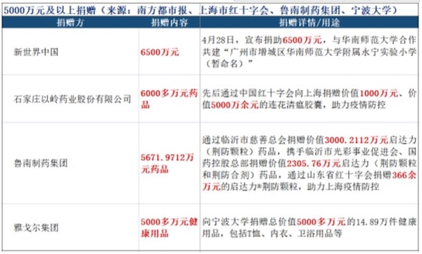捐贈金額在5000萬元至1億元(不含)的共四筆,分別是新世界中國捐助6500萬元,以嶺藥業(yè)捐贈價值6000余萬元藥品,魯南制藥集團捐贈價值5671.9712萬元藥品,雅戈爾集團捐贈價值5000多萬元健康用品。