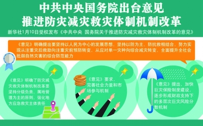 《中共中央 國務院關于推進防災減災救災體制機制改革的意見》1月10日公布。民政部相關負責人表示,《意見》著眼當前我國防災減災救災工作面臨的問題和體制機制方面的制約因素,通過頂層設計,針對三大體制機制完善升級提出了一系列改革舉措,有助于不斷提升我國防災減災救災能力。