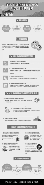 2月20日,新華社公布了中共中央辦公廳、國務院辦公廳印發(fā)的《關于加強鄉(xiāng)鎮(zhèn)政府服務能力建設的意見》。《意見》提出,要以強化鄉(xiāng)鎮(zhèn)政府服務功能為重點,以優(yōu)化服務資源配置為手段,以創(chuàng)新服務供給方式為途徑,有效提升鄉(xiāng)鎮(zhèn)政府服務水平,切實增強人民群眾的獲得感和幸福感。