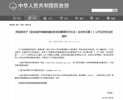 12月7日,民政部公布了《慈善組織保值增值投資活動(dòng)管理暫行辦法(征求意見(jiàn)稿)》(以下簡(jiǎn)稱《辦法》),并向社會(huì)公開(kāi)征求意見(jiàn)。意見(jiàn)反饋截止時(shí)間為2018年1月6日。