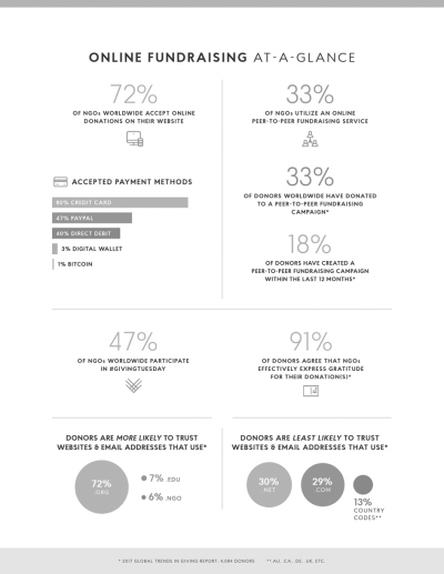 報告的全球主要調(diào)查結(jié)果顯示:92%的受訪者擁有一家網(wǎng)站,其中87%兼容移動設(shè)備,較2017年增長9%;電子郵件是與捐贈者進行溝通的首選方式,63%的受訪者定期發(fā)送電子郵件更新,18%的受訪者使用消息應(yīng)用,15%的受訪者定期向支持者發(fā)送短信。72%的受訪者接受在線捐贈,較2017年增長5%;非政府組織受訪者表示,使用客戶關(guān)系管理(CRM)軟件來管理與捐贈者之間的溝通(45%),其中64%使用基于云的CRM軟件。