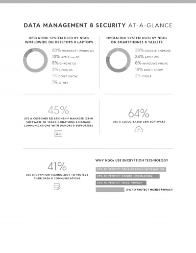 在數(shù)據(jù)安全上,只有41%的全球受訪者使用加密技術(shù)來保護數(shù)據(jù)和通信。Nonprofit Tech for Good創(chuàng)始人Heather Mansfield表示:“全球非政府組織正在快速擴大技術(shù)應(yīng)用,隨著對技術(shù)依賴性的增加,他們的數(shù)據(jù)管理和安全需求也隨之增長,2018年報告的調(diào)查結(jié)果證實了這點。今年的報告首次為組織和捐贈數(shù)據(jù)的管理和保護提供了基準。非政府組織在這方面落后于私營機構(gòu),通過提供基準,我們希望鼓勵非政府組織升級他們的數(shù)據(jù)管理和安全業(yè)務(wù)。”