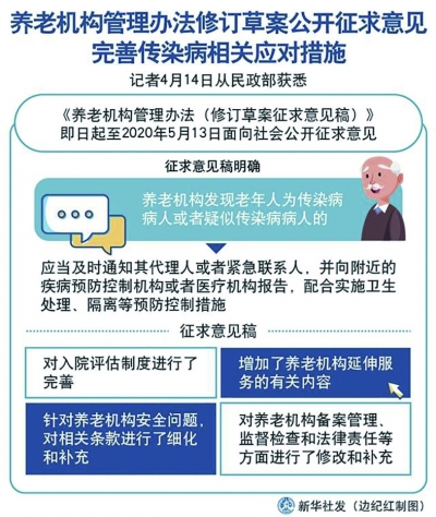 4月14日,民政部對外公布了《養(yǎng)老機構(gòu)管理辦法(修訂草案征求意見稿)》(以下簡稱《征求意見稿》),并向社會各界征求意見。意見反饋截止時間為2020年5月13日。