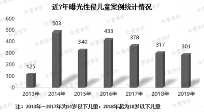 “女童保護(hù)”統(tǒng)計(jì),2019年全年媒體公開報(bào)道的性侵兒童(18歲以下)案例301起,受害人數(shù)807人,年齡最小的為4歲。2013年至2018年,每年媒體公開報(bào)道的兒童被性侵的案例分別是125起、503起、340起、433起、378起、317起(其中,2013年—2017年統(tǒng)計(jì)案例為14歲以下兒童,2018年起為18歲以下兒童)。
