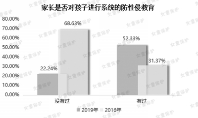 關(guān)于家長(zhǎng)對(duì)孩子進(jìn)行系統(tǒng)的防性侵教育的次數(shù),2019年接受調(diào)查的家長(zhǎng)中有22.24%的人表示沒有過,2016年這一數(shù)據(jù)是68.63%;明確有過的占比52.33%,2016年這一數(shù)據(jù)是31.37%。2019年的調(diào)查顯示,50.05%的家長(zhǎng)正在學(xué)習(xí)兒童防性侵知識(shí),5.94%的家長(zhǎng)已經(jīng)有了比較豐富的知識(shí)儲(chǔ)備??梢钥闯?,家長(zhǎng)對(duì)孩子的防性侵教育在不斷完善,自身的知識(shí)能力也在不斷提高。