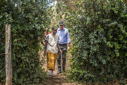 在肯尼亞,蓋茨基金會(huì)首席執(zhí)行官馬克·蘇斯曼(右)與一名當(dāng)?shù)厝俗咴诤笳叩霓r(nóng)場(chǎng)里