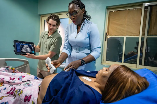 在尼日利亞,工程師正在協(xié)助婦產(chǎn)科顧問(wèn)使用孕期檢測(cè)傳感器為孕婦進(jìn)行檢查。這款人工智能傳感器可以實(shí)時(shí)監(jiān)測(cè)胎兒生命體征和宮縮情況