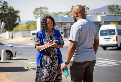 在南非,一名社區(qū)聯(lián)絡(luò)官正向來(lái)訪者介紹臨床試驗(yàn)點(diǎn)提供的服務(wù)