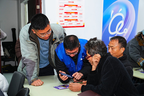 在藍(lán)馬甲志愿者的幫助下,村醫(yī)們認(rèn)真學(xué)習(xí)如何使用螞蟻阿福APP