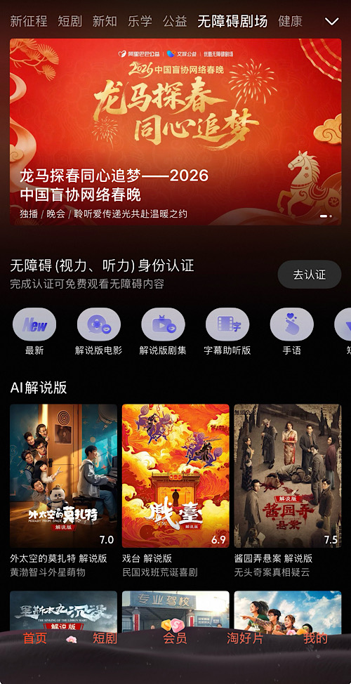 優(yōu)酷無障礙劇場(chǎng)直播“龍馬探春,同心追夢(mèng)——2026中國盲協(xié)網(wǎng)絡(luò)春晚”。