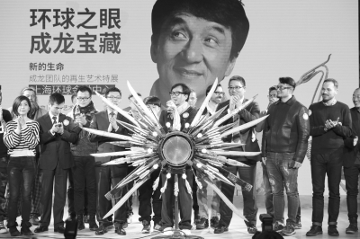 2017年3月16日下午,“環(huán)球之眼 成龍寶藏”——成龍團隊的再生藝術特展開幕式在上海環(huán)球金融中心94樓盛大舉行,國際巨星成龍及其團隊、參展藝術家代表等盛裝出席。在現場,無論是背景板上醒目的“再設計,再使用”標記,還是舞蹈演員身上用膠片制成的華服,抑或是由電影拍攝器材組裝而成的啟動裝置,無不透露出此次展覽“快樂環(huán)保”的主題。