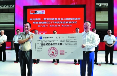 2017年8月18日,寶豐燕寶慈善基金會三期捐資助學項目啟動暨獎學金發(fā)放儀式在銀川國際商貿(mào)城隆重舉行。寧夏回族自治區(qū)相關(guān)領(lǐng)導出席儀式,自治區(qū)統(tǒng)戰(zhàn)部、教育廳、民政廳等有關(guān)部門、各市縣區(qū)代表及教育系統(tǒng)和受助學生代表參加活動。