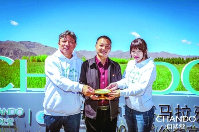 張波副縣長(中)為自然堂公益一行贈(zèng)送草籽2019年7月,伽藍(lán)集團(tuán)公關(guān)傳播總經(jīng)理陳涓玲再次踏足西藏這片神圣的土地。