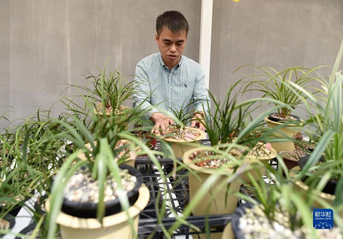 浙江省紹興市柯橋區(qū)漓渚鎮(zhèn)棠棣村的村民在照料蘭花(2018年4月25日攝)。新華社記者 韓傳號(hào) 攝