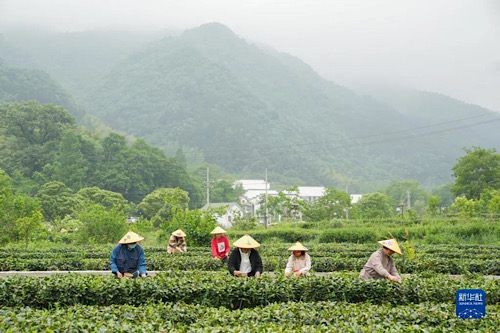 安徽省金寨縣大灣村村民在生態(tài)茶園采摘茶葉(2022年5月11日攝)。新華社記者 杜宇 攝