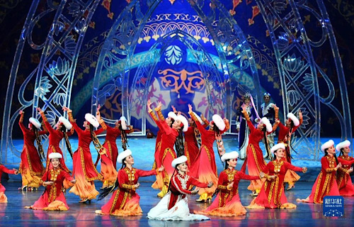 在新疆木卡姆藝術(shù)團(tuán)劇場(chǎng),演員在表演《木卡姆印象》(2017年8月3日攝)。新華社記者 王菲 攝