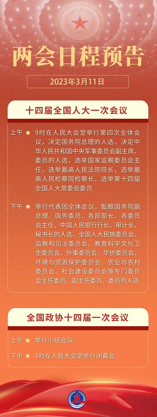 3月11日,人代會繼續(xù)選舉和決定任命國家機構組成人員,全國政協(xié)十四屆一次會議舉行閉幕會。