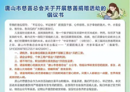 在河北唐山,唐山市慈善總會(huì)于“中華慈善日期間發(fā)布關(guān)于開(kāi)展慈善捐贈(zèng)活動(dòng)的倡議書(shū)。倡議書(shū)提出:請(qǐng)機(jī)關(guān)、事業(yè)單位現(xiàn)職及離退休干部職工捐出一天的工資;請(qǐng)企業(yè)單位、個(gè)體工商戶捐出一天的利潤(rùn);請(qǐng)不同行業(yè)、職業(yè)的群眾朋友捐出一天的生活費(fèi);請(qǐng)富有愛(ài)心的朋友關(guān)注“唐山市慈善總會(huì)”公眾號(hào),將倡議書(shū)轉(zhuǎn)發(fā)給朋友、親友、戰(zhàn)友……據(jù)悉,此次籌集善款將用于唐山市困境兒童救助。