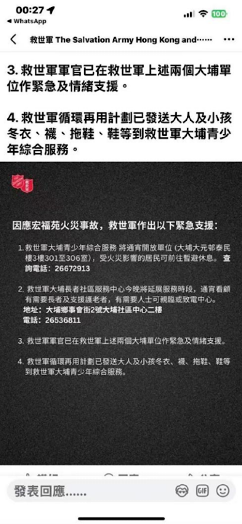 香港本土公益機(jī)構(gòu)救世軍給記者發(fā)來救援安排