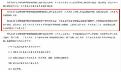 第七條規(guī)定,國有文物收藏單位對(duì)擬退出的館藏文物履行備案或?qū)徟绦?,?yīng)將館藏文物的基本情況、退出理由、退出后的處置方案等進(jìn)行不少于30個(gè)工作日的公示期,接受社會(huì)監(jiān)督。