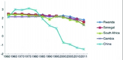 1960年至2011年,中國(guó)與若干非洲國(guó)家瘧疾發(fā)病率Log10(1/10000)