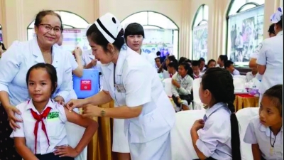 2015年,老撾兒童接種中國(guó)研發(fā)并生產(chǎn)的乙腦疫苗