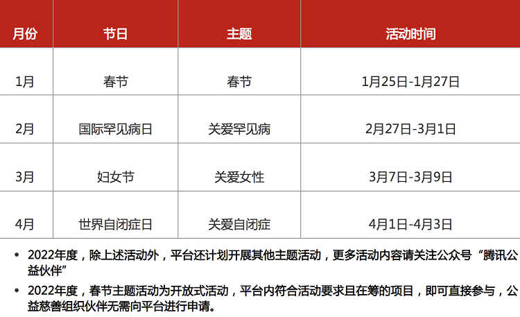 2022年,騰訊公益平臺(tái)將在每個(gè)月份開放一場(chǎng)“主題小紅花日配捐活動(dòng)”,將溫暖延伸到全年。每場(chǎng)主題小紅花配捐活動(dòng),騰訊公益慈善基金會(huì)都將提供配捐。一季度的小紅花主題日配捐活動(dòng)已經(jīng)出爐,分別是“新春小紅花日”、“關(guān)愛罕見病小紅花日”、“關(guān)愛女性小紅花日”和“關(guān)愛自閉癥小紅花日”。主題日的立意更多是希望能夠讓大家關(guān)注到這些議題,去幫助有需要的人群,也希望可以通過主題日的方式讓更多小眾的好項(xiàng)目被看見。