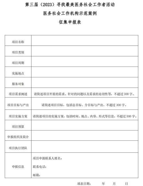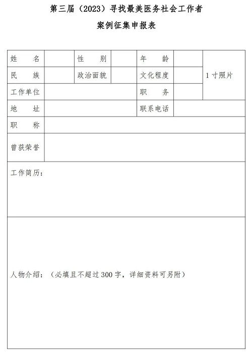 (點擊鏈接http://m.yataiyl.com/files/2023/04/747923088217443f9d988ae3ff3abea0.docx下載第三屆(2023)尋找最美醫(yī)務(wù)社會工作者案例征集申報表)