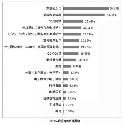 2016年組織傳播渠道的選擇中,59.13%的公益組織選擇將“微信公眾號”納入2016年的傳播戰(zhàn)略中。其次為微信和微信群(53.30%),第三名官網(wǎng)的比例已經(jīng)下降到了25.42%。下降比例最大的是微博,從第四次調(diào)研的25.96%大幅下降為9.98%。