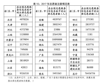 志愿服務(wù)組織發(fā)展情況。截至2017年底,在民政部門依法登記的、名稱中含有“志愿”或“義工”字樣的志愿服務(wù)組織達11328家,單位和社區(qū)內(nèi)部成立志愿服務(wù)團隊567537個,全國志愿服務(wù)站點總量達91975個。