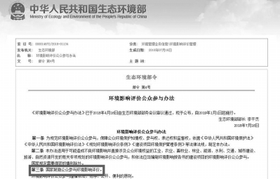 生態(tài)環(huán)境部近日印發(fā)了《環(huán)境影響評價(jià)公眾參與辦法》(以下簡稱《公參辦法》),于2019年1月1日起實(shí)施。