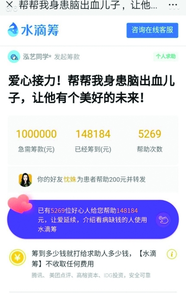 截至5月3日下午,根據(jù)“水滴籌”平臺(tái)顯示,該項(xiàng)目共籌得14.8萬元,5269人次參與贈(zèng)與,暫未申請(qǐng)?zhí)岈F(xiàn),發(fā)起人與水滴籌溝通已停止籌款。