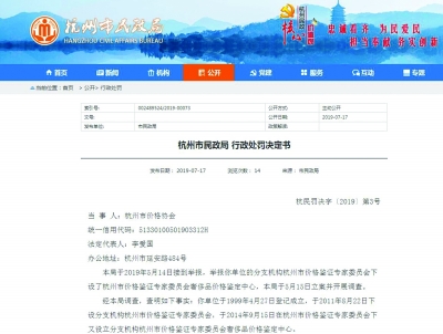 7月17日,杭州市民政局發(fā)布《行政處罰決定書》?!缎姓幜P決定書》確認:
