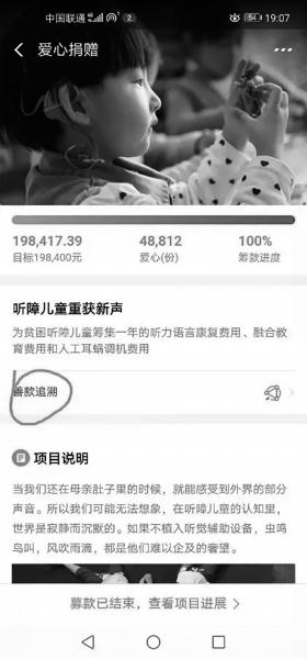 幸運(yùn)的是,一個(gè)月后,即2016年7月,螞蟻金服與中華社會(huì)救助基金會(huì)合作,在支付寶愛(ài)心捐贈(zèng)平臺(tái)上線(xiàn)了區(qū)塊鏈公益籌款項(xiàng)目“聽(tīng)障兒童重獲新聲”,為10名聽(tīng)障兒童籌款。很快,將近5萬(wàn)人次籌集了198400元善款,作為孩子們的康復(fù)費(fèi)用。