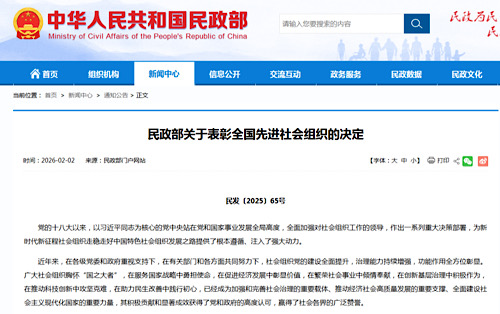 2月2日,民政部官網(wǎng)發(fā)布關(guān)于表彰全國(guó)先進(jìn)社會(huì)組織的決定。