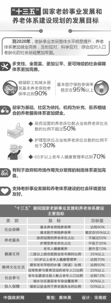 為應(yīng)對老齡化問題,《規(guī)劃》提出了發(fā)展目標(biāo):到2020年,老齡事業(yè)發(fā)展整體水平明顯提升,養(yǎng)老體系更加健全完善,及時應(yīng)對、科學(xué)應(yīng)對、綜合應(yīng)對人口老齡化的社會基礎(chǔ)更加牢固。