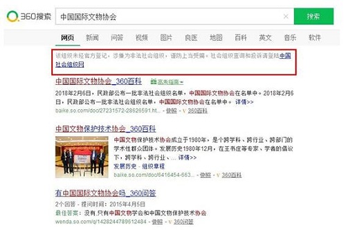 當用戶所搜索社會組織系涉嫌非法社會組織時,360搜索會在置頂位置進行風險提示“該組織未經(jīng)官方登記,涉嫌為非法社會組織,謹防上當受騙”,聲明該組織未在民政部門登記,存在侵害用戶權益的風險。