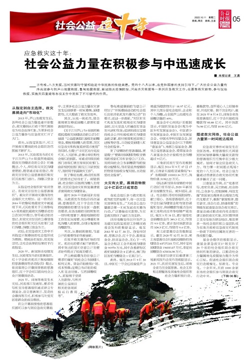 從地震、水災(zāi)等自然災(zāi)害到新冠肺炎疫情等公共衛(wèi)生突發(fā)事件,從國內(nèi)到國際,我國社會(huì)公益力量不僅在應(yīng)急救援中發(fā)揮了重要作用,自身也在迅速成長,進(jìn)入新時(shí)代,必將發(fā)揮更加重要的作用。(李慶、皮磊、于俊如、張明敏、馬興帆參與采訪報(bào)道)