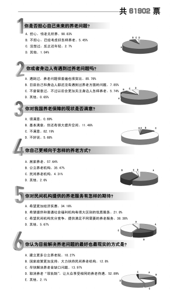 ■ 本報記者 張雪弢 有資料顯示,截至2011年底,全國60歲及60歲以上的老年人口接近1.85億人,占到總?cè)丝诘?3.7%。而我國人口老齡化程度還將進一步加深。到2030年,中國65歲以上人口占比將超過日本,成為全球人口老齡化程度最高的國家。 看到這樣的數(shù)據(jù),你是否有提前規(guī)劃老年生活的打算? 圍繞著養(yǎng)老問題的話題一再地被熱議:延遲退休制度設(shè)想到底實行不實行,目前尚無定論。但估計對中國社?;馉顩r略有了解的人,都難掩擔憂——如現(xiàn)狀不改變,養(yǎng)老基金虧空難填,自己數(shù)十年后的老年生活可能保障乏力,生活質(zhì)量會受到非常直接的影響。 養(yǎng)老難題誰來解?你是否擔心自己未來的養(yǎng)老問題呢?對于可能會成為養(yǎng)老服務(wù)重要力量的民間機構(gòu)你有怎樣的期待?《公益時報》與搜狐公益聯(lián)手推出的“益調(diào)查”結(jié)果顯示,90.83%的網(wǎng)友擔心自己老無所養(yǎng),超過八成的網(wǎng)友自己或身邊人都遇到過養(yǎng)老問題。 調(diào)查結(jié)果: 本次調(diào)查從9月26日10時至10月8日10時,共有61902位網(wǎng)友參與調(diào)查。調(diào)查結(jié)果顯示,超過九成的網(wǎng)友表示擔心自己未來的養(yǎng)老問題,怕老無所養(yǎng)。5.45%的網(wǎng)友則表示并不擔心,已經(jīng)考慮好未來怎樣養(yǎng)老。少部分網(wǎng)友表示沒想過未來怎樣養(yǎng)老的問題,反正自己還年輕。網(wǎng)友“軒川寺苑”留言說:兩個孩子,要照顧四個老人,這還是孝順的,如果沒人管你,那可就慘了,能不擔心嗎。 在“你或者身邊人有遇到過養(yǎng)老問題嗎?”的調(diào)查中,85.78%的網(wǎng)友表示遇到過,養(yǎng)老問題很普遍也很突出。7.85%的網(wǎng)友則表示,目前自己和身邊人都還沒有遇到過養(yǎng)老方面的問題。5.74%的參與調(diào)查者表示,不曾留意過,不過以后會更加關(guān)注身邊人怎樣養(yǎng)老。 大家對我國養(yǎng)老保障的現(xiàn)狀是否滿意呢?82.19%的網(wǎng)友并不滿意。11.46%的網(wǎng)友表示基本滿意,但還有很大提升空間。僅有0.69%的網(wǎng)友表示很滿意,還有部分網(wǎng)友認為不好說。網(wǎng)友“dolphinyu”留言說:希望我們的國家在養(yǎng)老的方法上更多地借鑒西方社會福利保障做得好的國家的方法。 養(yǎng)老方式有多種,而大家更傾向于怎樣的養(yǎng)老方式呢?在參與調(diào)查的網(wǎng)友中,近六成網(wǎng)友都選擇了居家養(yǎng)老,35.47%的網(wǎng)友選擇了公立養(yǎng)老機構(gòu)。值得注意和思考的數(shù)據(jù)是,僅有4.31%的網(wǎng)友選擇了民間養(yǎng)老機構(gòu)。 盡管選擇民間養(yǎng)老機構(gòu)的網(wǎng)友并不多,但大家還是對民間機構(gòu)提供的養(yǎng)老服務(wù)有所期待的。 在“你對民間機構(gòu)提供的養(yǎng)老服務(wù)有怎樣的期待?”的調(diào)查中,38.38%的網(wǎng)友希望民間機構(gòu)充分競爭,提供滿足不同需要的養(yǎng)老服務(wù)。34.16%的網(wǎng)友則希望更加經(jīng)濟實惠。還有21.8%的網(wǎng)友希望提供和普通社會福利機構(gòu)有很大區(qū)別的優(yōu)質(zhì)服務(wù)。 那么,在網(wǎng)友心中目前解決養(yǎng)老問題的最好也最現(xiàn)實的方式是什么呢?52.89%的網(wǎng)友認為應(yīng)該取消養(yǎng)老“雙軌制”,讓大眾享受相同的養(yǎng)老待遇。18.27%的網(wǎng)友建議建立更多公立養(yǎng)老院。13.97%的網(wǎng)友希望盡快解決養(yǎng)老金缺口問題。還有部分網(wǎng)友期待國家政策更加支持,大力扶持民間養(yǎng)老機構(gòu)。網(wǎng)友“修身養(yǎng)心205970”留言說:退休雙軌制不取消,養(yǎng)老會成為社會問題;差距太大,貧富不均,老年人沒有幸福感,年輕人沒有安全感。 |