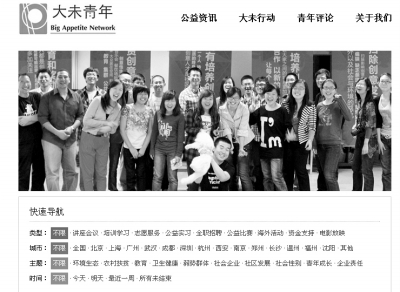 一方面,公益資訊組的成員定期搜集篩選各種公益資訊,包括公益講座、公益活動(dòng)、志愿和就業(yè)機(jī)會(huì)等,這些資訊大多面向新四年人群。每周整理成“公益資訊菜單”,發(fā)布在大未青年的郵件組、網(wǎng)站、微博等各個(gè)渠道。另一方面,每月組織的“聚·大未”線下活動(dòng),是以聚餐、茶話會(huì)、觀影等形式展開(kāi)的小型聚會(huì),每次圍繞一個(gè)選題交流?!拔覀兲峁┑氖且粋€(gè)平臺(tái),將參與公益實(shí)踐的青年聚集到一起,使青年們能收獲友誼,了解資訊,碰撞思維?,F(xiàn)在我們計(jì)劃把大未聚會(huì)的模式推廣到更多地方,建立地區(qū)內(nèi)的公益青年關(guān)系網(wǎng)絡(luò)?!睆堎徽f(shuō)。