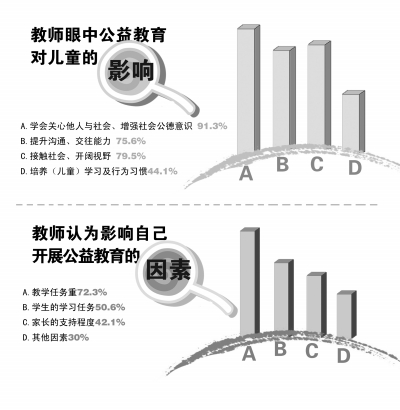 學(xué)校教育是影響青少年成長的主導(dǎo)力量,學(xué)校是公益教育開展的重要場所和主體。學(xué)校教育中最為關(guān)鍵的要素是教師,教師對公益教育的認(rèn)識、認(rèn)同及開展公益教育的素養(yǎng)是決定學(xué)校公益教育開展情況的至關(guān)重要的因素。因此,在公益教育開展中,需要了解教師的有關(guān)情況,以準(zhǔn)確把握在中小學(xué)開展什么樣的公益教育,并有效地引導(dǎo)教師參與到公益教育中。 北京市海淀區(qū)位于北京城區(qū)西北部,其轄區(qū)內(nèi)約一半?yún)^(qū)域的學(xué)校為通常意義上的市區(qū)學(xué)校,另一半?yún)^(qū)域的學(xué)校為郊區(qū)或農(nóng)村學(xué)校;既有在北京市辦學(xué)層次處于一類的學(xué)校,也有辦學(xué)層次較低的學(xué)校。因此,在該區(qū)域選擇若干學(xué)校進(jìn)行調(diào)查具有較大的代表性。北京師范大學(xué)社會發(fā)展與公共政策研究院的公益教育研究所對該區(qū)21所學(xué)校的1000名教師進(jìn)行了公益教育方面的調(diào)研。調(diào)查發(fā)現(xiàn),目前小學(xué)教師對公益教育的了解和開展的公益教育有限。 公益認(rèn)知缺乏深度 大部分小學(xué)教師對公益有一定認(rèn)識,但是不夠全面和深入。對“公益”的認(rèn)識主要局限在常識意義的理解上,偏重于“指向于他人的”,而缺乏指向于“集體”或“社會”的理解。 在“您認(rèn)為公益是 ”的多項選擇調(diào)查中,被選擇最多的選項是“為他人服務(wù)”,占教師總數(shù)的83.8%;次多的選項是“志愿精神”,72.9%的人選擇了這一項,說明了大部分認(rèn)為“公益”是一種自愿的行為,甚至有36.2%的人認(rèn)為公益是“犧牲自我、不求回報”的行為。有53.9%的教師認(rèn)為“公益”是“公共利益”。比較而言,認(rèn)為“公益”是“指向于他人的”人數(shù)比認(rèn)為是“公共利益”的人數(shù)多29.9%,接近三分之一。 對“公益教育”這一概念,有16.6%的人沒有聽說過,有69.8的人“了解一點”,兩項合計為“86.4%”;“比較了解”和“非常了解”的共占13.6%,說明大部分教師雖然對“公益”一詞不陌生,但是對“公益教育”的了解較少。就目前的理解來說,認(rèn)為其與“品格、道德教育”最相似的教師比例最高,達(dá)到64.5%,有62.8%的人認(rèn)為其是“培養(yǎng)志愿精神”,一半左右的教師認(rèn)為其與“人文教育”、“公民教育”、“素質(zhì)教育”相似。 公益教育的實施有哪些作用?在公益對兒童的影響方面,教師更為看重“指向于他人”的方面,91.3%的教師認(rèn)為是讓學(xué)生“學(xué)會關(guān)心他人與社會”、“增強(qiáng)社會公德意識”,而選擇公益教育的影響是促進(jìn)孩子自身發(fā)展的“提升溝通、交往能力”和“接觸社會、開闊視野”的比例分別是75.6%和79.5%,認(rèn)為公益教育能夠“培養(yǎng)(兒童)學(xué)習(xí)及行為習(xí)慣”的教師僅有44.1%。 公益教育偏重人文類課程 大多數(shù)小學(xué)教師認(rèn)為公益教育的實施途徑主要為德育方面的課程與活動,是否能融入到其他學(xué)科教學(xué)之中,與這門課是否有活動形式的教學(xué)有關(guān)系。 與上述關(guān)于公益及公益教育的認(rèn)識相關(guān)的是,“在哪些課程或活動中體現(xiàn)公益教育”的調(diào)查中,有超過50%的教師認(rèn)為不能在品德課程、班會活動或德育活動之外的課程中進(jìn)行。 除了品德課程之外,認(rèn)為在語文學(xué)科中可以融入公益教育的教師最多,可能與語文的人文性是有關(guān)系的。在小學(xué)教育中,語文教育既擔(dān)負(fù)著工具性的教學(xué)讀寫等之外,還肩負(fù)著對學(xué)生進(jìn)行“人文”教育的任務(wù)。英語、數(shù)學(xué)、體育和科學(xué)被選擇得很少,這與教師關(guān)于這些學(xué)科的學(xué)科觀有關(guān)系。 深入分析,教師認(rèn)為一門課能否融入公益教育,與這門課是否有活動形式的教學(xué)有關(guān)系,結(jié)合項目組的訪談內(nèi)容可發(fā)現(xiàn),大多數(shù)老師都認(rèn)同公益教育需要通過一系列有計劃的活動,才能將公益理念落實。 選擇“藝術(shù)”和“健康教育”的人數(shù)比語文之外的其他學(xué)科多,可能是因為藝術(shù)、健康教育中的活動居多;選擇“科學(xué)”的明顯比選擇英語、數(shù)學(xué)、體育的教師多,也可能是因為這一學(xué)科中的活動比其他學(xué)科多。 時間、精力、安全問題突出 調(diào)查中發(fā)現(xiàn),目前中小學(xué)教師開展公益教育的情況較少,并且不同學(xué)校存在著較大差異。那么,教師開展公益教育與哪些因素相關(guān)呢?時間、精力、安全問題是影響小學(xué)教師選擇開展公益教育的重要因素。這可能與他們關(guān)于公益教育主要以“活動”形式開展的認(rèn)識是有關(guān)的,因為認(rèn)為是“活動”,因而就認(rèn)為需要在正常課堂教學(xué)活動之外安排單獨時間開展,這勢必“擠壓”當(dāng)前師生的教育教學(xué)和學(xué)習(xí)情況;因為認(rèn)為是“活動”,尤其是“服務(wù)于他人”的活動,就認(rèn)為需要走出校門,因此就會存在著安全問題。 家長是學(xué)校教育中的重要影響因素,尤其是作為兒童的監(jiān)護(hù)人,可以決定孩子是否參加日常教育教學(xué)之外的活動,因此,了解教師與家長溝通和爭取