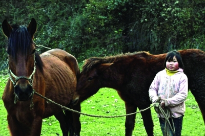 泥樹小學唯一的老師臨時有事,學校放假半天。下課后,孩子們就紛紛返回家?guī)椭依锏睦先烁杉覄?wù),圖中是一名小女孩從家里牽出的兩匹瘦馬。 |