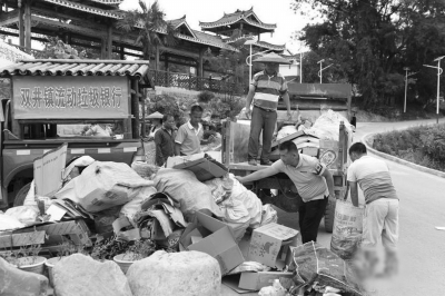 7月8日,“銀行”將收到的生活垃圾裝車,運送至回收站。貴州省施秉縣雙井鎮(zhèn)翁西村開辦“垃圾銀行”,通過“經(jīng)濟利益”來引導民眾養(yǎng)成垃圾收集分類與投放的良好習慣?!袄y行”采取的垃圾商品兌換方式是積分制,村民們可根據(jù)不同垃圾種類進行入賬登記積分,積分有2至15分不等分值,所積分數(shù)達到商品種類規(guī)定分值后即可兌換新的生活用品。