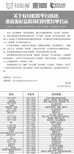 7月10日,輕松籌截獲并關(guān)閉該平臺個人求助版塊上于當(dāng)日發(fā)起的“眾籌喪葬費(fèi)”項目,將該違規(guī)項目籌集到的資金原路退回; 7月12日,輕松籌又截獲和關(guān)停在幾分鐘內(nèi)發(fā)起的2000多例“購買GTR”“購買邁凱倫”等惡意籌款項目,對所涉資金進(jìn)行凍結(jié),并向公安機(jī)關(guān)報案…… 實際上,從大病眾籌平臺誕生至今的四年時間內(nèi),違規(guī)、惡意項目的發(fā)起時常困擾著各家平臺,消耗大眾的愛心的同時,也對大病救助這一領(lǐng)域的氛圍造成了負(fù)面影響,嚴(yán)重阻礙行業(yè)發(fā)展。 近日,面對今年接踵襲來的以假病歷發(fā)起項目、違規(guī)和惡意項目等事件,輕松籌決定正面著手解決這類困擾整個大病救助領(lǐng)域的“亂象”,推出“黑名單”機(jī)制,對惡意求助者采取“零容忍”態(tài)度,并與同行業(yè)平臺共享“黑名單”信息,以期共同為大病患者和愛心公眾塑造良好的大病救助環(huán)境。 第一份行業(yè)“黑名單” 7月23日,輕松籌發(fā)布我國第一份大病眾籌領(lǐng)域“黑名單”,將目前輕松籌個人求助版塊上惡意項目的發(fā)起人予以信息公示。 輕松籌表示,對于購買病歷、違背社會公序良俗、惡意發(fā)起等情況采取“零容忍”態(tài)度。“黑名單”上的人員,將不能在輕松籌上發(fā)起任何項目,對于情節(jié)惡劣涉嫌刑事犯罪的,輕松籌還將積極配合公安部門進(jìn)行調(diào)查。 自2014年以來,隨著互聯(lián)網(wǎng)技術(shù)的不斷成熟,借助“熟人社交”的優(yōu)勢,數(shù)家大病眾籌平臺如雨后春筍般出現(xiàn),讓無力支付醫(yī)療費(fèi)用的大病患者找到了生的希望,更讓公眾不斷擴(kuò)大的愛心釋放需求得到滿足。 然而,4年來,也常有不符合發(fā)起條件的眾籌項目出現(xiàn)在各家平臺之上,更有甚者惡意發(fā)起違規(guī)項目,罔顧這一行為對大病救助領(lǐng)域的環(huán)境破壞。2016年實施的《慈善法》并未對個人求助領(lǐng)域進(jìn)行規(guī)制,也一定程度上讓惡意發(fā)起者無所忌憚。 此次輕松籌發(fā)布“黑名單”是行業(yè)首度正面這一問題,極大增加了惡意發(fā)起者擾亂正常秩序的成本和難度,從而維護(hù)輕松籌用戶的合法權(quán)益,保護(hù)愛心人士的愛心不因惡意項目的傳播而受到傷害。 近探“黑名單” 記者發(fā)現(xiàn),“黑名單”首批記錄的500組信息中,其項目標(biāo)題以含有“購買GTR”字樣居多,另有一些不堪入目的籌款請求,的確為惡意發(fā)起行為。 在此十余天前,輕松籌就曾于短短幾分鐘內(nèi)接到大量“購買GTR”“購買邁凱倫”“購買帕拉梅拉”的惡意籌款項目申請,數(shù)量竟達(dá)到2000多例。平臺工作人員與發(fā)起者取得聯(lián)系時,不少人竟表示是為了“好玩兒”。輕松籌第一時間關(guān)停了這些項目、凍結(jié)所籌資金,并向公安機(jī)關(guān)報案。 與大多數(shù)大病眾籌平臺相似,輕松籌平臺的用戶在注冊時需填入有效手機(jī)號碼,此次“黑名單”所公示的手機(jī)號碼將不能再用于注冊和發(fā)起籌款項目,也就在很大程度上避免了惡意發(fā)起人再次注冊新ID來發(fā)起新項目,這將大規(guī)模減少惡意項目的申請。 此外,日前備受關(guān)注的“眾籌喪葬費(fèi)”項目的發(fā)起人信息也被“黑名單”登記在案,這意味著,今后用戶在發(fā)起項目時需謹(jǐn)慎比照項目發(fā)起條件,莫將不屬于大病救助類別的籌款在平臺上發(fā)起。 輕松籌表示,個人籌款通道應(yīng)為大病患者專用,目前平臺上每天都有很多患者和家庭在急切地等待幫助,應(yīng)為他們讓出寶貴的生命通道。 推動行業(yè)共建相關(guān)機(jī)制 作為大病眾籌領(lǐng)域的領(lǐng)頭羊,輕松籌不但發(fā)布首份“黑名單”,更考慮到各家平臺對惡意項目的發(fā)起都深惡痛絕,決定將與同行業(yè)平臺共享“黑名單”相關(guān)信息,打造行業(yè)機(jī)制。 在該機(jī)制下,除分享“黑名單”信息外,輕松籌還將信息上報網(wǎng)信辦、衛(wèi)健委等相關(guān)政府部門。 輕松籌表示:“生命無價,請給真正有需要幫助的人讓開生命通道,不要消耗大眾的愛心。輕松籌將與與同行業(yè)平臺及執(zhí)法部門形成聯(lián)動,維護(hù)行業(yè)環(huán)境,為大病患者及愛心人士塑造良好的大病救助環(huán)境?!?/p> ■ 本報記者 高文興 |