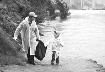 10月13日,參加“益起愛河”水資源保護(hù)公益活動的一對父子在重慶嘉陵江邊清理垃圾。當(dāng)日,“益起愛河”水資源保護(hù)公益活動在重慶正式啟動?;顒又荚谕ㄟ^河道清理、城市水源工程探訪、濕地保護(hù)區(qū)調(diào)研等行動,號召更多社會人士投身于水資源生態(tài)保護(hù)工作。