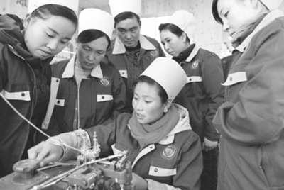 甘肅省臨夏回族自治州東鄉(xiāng)族自治縣大樹鄉(xiāng)“扶貧車間”近日投入使用,40多名留守婦女在家門口實(shí)現(xiàn)就業(yè)。今年以來,共青團(tuán)臨夏州委積極爭(zhēng)取東西協(xié)作城市廈門市的支持,建立“扶貧車間”。圖為大樹鄉(xiāng)“扶貧車間”內(nèi),當(dāng)?shù)貑T工向熟練工(中)學(xué)習(xí)操作技巧。 新華社記者 范培珅/攝