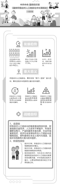 ■ 本報記者 王勇 為積極應對人口老齡化,按照黨的十九大決策部署,近日,中共中央、國務院印發(fā)了《國家積極應對人口老齡化中長期規(guī)劃》(以下簡稱《規(guī)劃》)?!兑?guī)劃》近期至2022年,中期至2035年,遠期展望至2050年,是到本世紀中葉我國積極應對人口老齡化的戰(zhàn)略性、綜合性、指導性文件。 《規(guī)劃》明確了積極應對人口老齡化的戰(zhàn)略目標,即積極應對人口老齡化的制度基礎持續(xù)鞏固,財富儲備日益充沛,人力資本不斷提升,科技支撐更加有力,產(chǎn)品和服務豐富優(yōu)質(zhì),社會環(huán)境宜居友好,經(jīng)濟社會發(fā)展始終與人口老齡化進程相適應,順利建成社會主義現(xiàn)代化強國,實現(xiàn)中華民族偉大復興的中國夢。 到2022年,我國積極應對人口老齡化的制度框架初步建立;到2035年,積極應對人口老齡化的制度安排更加科學有效;到本世紀中葉,與社會主義現(xiàn)代化強國相適應的應對人口老齡化制度安排成熟完備。 《規(guī)劃》從5個方面部署了應對人口老齡化的具體工作任務。 我國老齡化程度將持續(xù)加深 人口老齡化是社會發(fā)展的重要趨勢,是人類文明進步的體現(xiàn),也是今后較長一段時期我國的基本國情。我國自20世紀末進入老齡化社會以來,老年人口數(shù)量和占總?cè)丝诘谋戎爻掷m(xù)增長,2000年至2018年,60歲及以上老年人口從1.26億人增加到2.49億人,老年人口占總?cè)丝诘谋戎貜?0.2%上升至17.9%。未來一段時間,老齡化程度將持續(xù)加深。 國家發(fā)展改革委負責人就《國家積極應對人口老齡化中長期規(guī)劃》答記者問時表示,積極應對人口老齡化,是黨中央、國務院正確把握人口發(fā)展大趨勢和老齡化規(guī)律,作出的立足當下、著眼長遠的重大戰(zhàn)略部署,事關實現(xiàn)“兩個一百年”奮斗目標,事關實現(xiàn)中華民族偉大復興的中國夢,對于堅持以人民為中心的發(fā)展思想、實現(xiàn)經(jīng)濟高質(zhì)量發(fā)展、維護國家安全和社會和諧穩(wěn)定,具有重大意義。 積極應對人口老齡化是貫徹以人民為中心的發(fā)展思想的內(nèi)在要求;是實現(xiàn)經(jīng)濟高質(zhì)量發(fā)展的必要保障;是維護國家安全和社會和諧穩(wěn)定的重要舉措。 三大階段性目標 據(jù)國家發(fā)展改革委負責人介紹,積極應對人口老齡化的戰(zhàn)略總目標是:積極應對人口老齡化的制度基礎持續(xù)鞏固,財富儲備日益充沛,人力資本不斷提升,科技支撐更加有力,產(chǎn)品和服務豐富優(yōu)質(zhì),社會環(huán)境宜居友好,經(jīng)濟社會發(fā)展始終與人口老齡化進程相適應,順利建成社會主義現(xiàn)代化強國,實現(xiàn)中華民族偉大復興的中國夢。 階段性目標分別是:到2022年,積極應對人口老齡化的制度框架初步建立。全員勞動生產(chǎn)率平穩(wěn)增長,勞動年齡人口平均受教育年限穩(wěn)步提升?;攫B(yǎng)老保險和基本醫(yī)療保險基本實現(xiàn)法定人員全覆蓋,養(yǎng)老保障水平正常調(diào)整機制初步建立。多層次養(yǎng)老保險制度體系初步構(gòu)建,功能完善、規(guī)模適度、覆蓋城鄉(xiāng)、醫(yī)養(yǎng)結(jié)合的養(yǎng)老服務體系基本建成,老年宜居的社會環(huán)境初步建立。 到2035年,積極應對人口老齡化的制度安排更加科學有效,社會財富儲備進入高收入國家行列。全員勞動生產(chǎn)率合理增長,總體實現(xiàn)教育現(xiàn)代化?;攫B(yǎng)老保險和基本醫(yī)療保險應保盡保,實現(xiàn)法定人員全覆蓋。構(gòu)建起多層次養(yǎng)老保險制度體系。主要健康指標進入高收入國家行列,人均預期壽命和健康預期壽命穩(wěn)步提升,老年人健康水平不斷提高,有序銜接、綜合連續(xù)的健康服務體系基本形成。中國特色養(yǎng)老服務體系成熟定型,全體老年人享有基本養(yǎng)老服務。國家創(chuàng)新能力躋身世界前列,科技對應對人口老齡化的支撐作用顯著增強。老年友好型社會總體建成。 到本世紀中葉,與社會主義現(xiàn)代化強國相適應的應對人口老齡化制度安排成熟完備,老年友好城市、友好鄉(xiāng)村、友好社區(qū)遍布全國,全體人民生活更加幸福安康,中華民族實現(xiàn)偉大復興,以更加昂揚的姿態(tài)屹立于世界民族之林。 五方面具體任務 《規(guī)劃》從5個方面部署了應對人口老齡化的具體工作任務。 第一,夯實應對人口老齡化的社會財富儲備。通過擴大總量、優(yōu)化結(jié)構(gòu)、提高效益,實現(xiàn)經(jīng)濟發(fā)展與人口老齡化相適應。通過完善國民收入分配體系,優(yōu)化政府、企業(yè)、居民之間的分配格局,穩(wěn)步增加養(yǎng)老財富儲備。健全更加公平更可持續(xù)的社會保障制度,持續(xù)增進全體人民的福祉水平。 第二,改善人口老齡化背景下的勞動力有效供給。通過提高出生人口素質(zhì)、提升新增勞動力質(zhì)量、構(gòu)建老有所學的終身學習體系,提高我國人力資源整體素質(zhì)。推進人力資源開發(fā)利用,實現(xiàn)更高質(zhì)量和更加充分就業(yè),確保積極應對人口老齡化的人力資源總量足、素質(zhì)高。 第三,打造高質(zhì)量的為老服務和產(chǎn)品供給體系。 《規(guī)劃》提出要加大養(yǎng)老服務投入力度,多渠道、寬領域擴大適老產(chǎn)品和服務供給。 一是提升居家社區(qū)養(yǎng)老品質(zhì)。建立完善支持